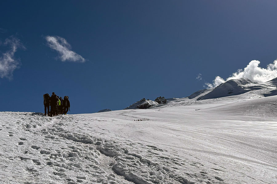 We travel as a group with a team of porters take the kit to the lodges and set up the camps on the mountain. There is a base camp and a high camp; it's possible to summit from base camp but we normally try to put in a camp on the snow.