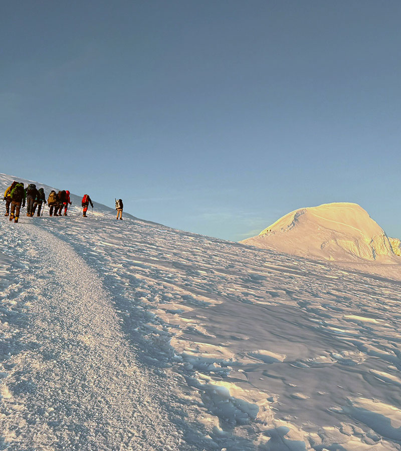 The views from the pass and first experience of mountaineering are spectacular. We first climb up to the Mera La (5,410m) and back up the ridge and then onto the back of the Mera base camp to for the night. Our freshly learned crampon and ice axe techniques will come in useful while climbing into the glacier.