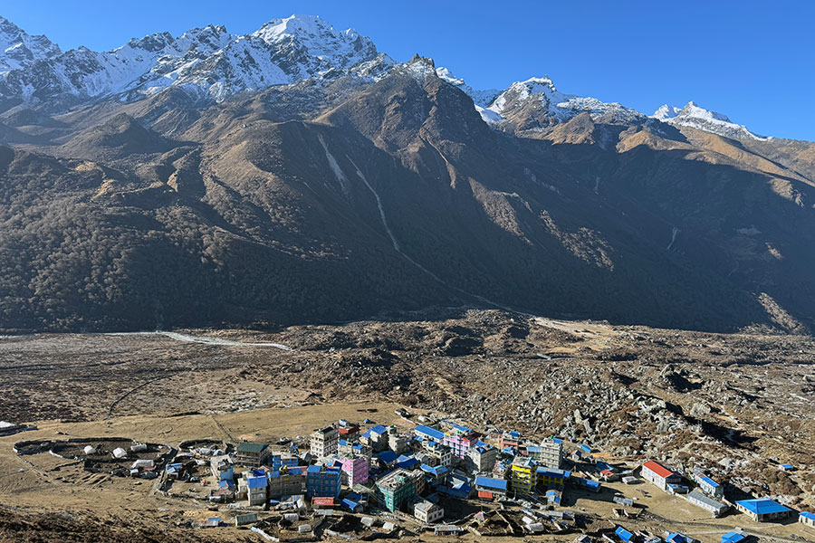 Nous nous dirigeons vers le village de Langtang, village important qui a donné son nom à la région Nous marchons dans la forêt, la vallée s'élargit, dominée par le Lantang Lirung (7225 m). Une heure et demi plus tard nous arrivons à Ghodatabela (2972 m), pause déjeuner à Thayangsyap (3140 m). Nous commençons à apercevoir le Tserko-Ri (4984 m). Le chemin monte doucement et en deux heures nous atteignons le village de Langtang (3410 m) dont les habitants sont majoritairement d'origine tibétaine. A l'horizon on aperçoit les pentes enneigées du Ganchenpo (6387 m). Le village a été entièrement détruit par le séisme de 2015 suite à une avalanche (roche, neige, glace). Le nouveau village est reconstruit légèrement plus haut dans la vallée. On peut encore voir les traces du tremblement de terre.