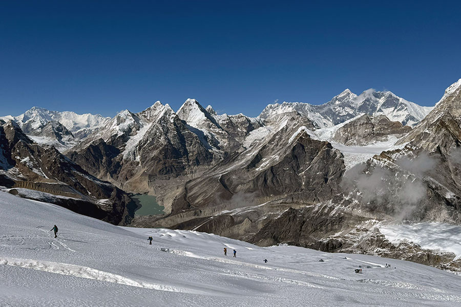 The views from the pass and first experience of mountaineering are spectacular. We first climb up to the Mera La (5,410m) and back up the ridge and then onto the back of the Mera base camp to for the night. Our freshly learned crampon and ice axe techniques will come in useful while climbing into the glacier.